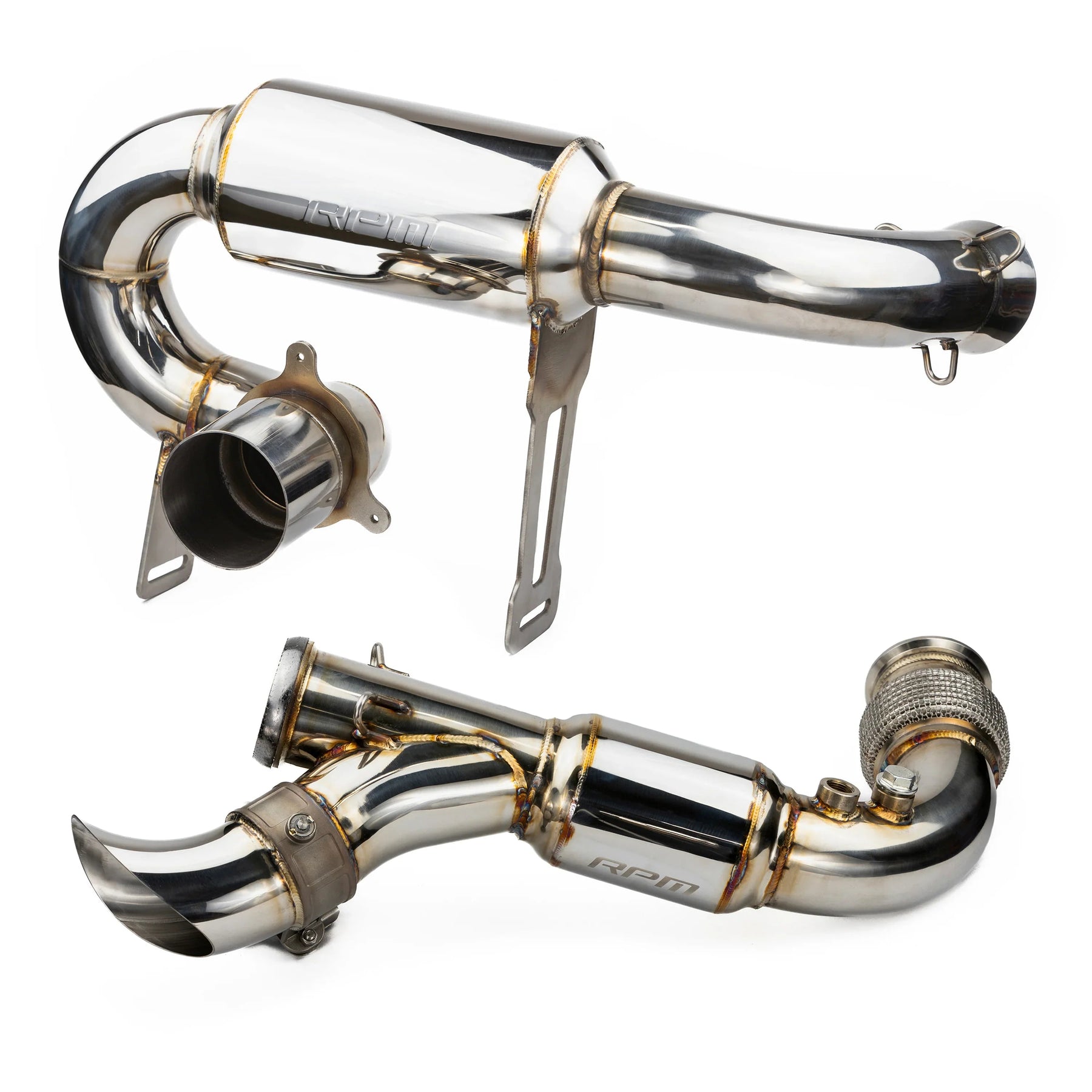 With the popularity of our RPM Sport Muffler and BRP's increase in power over since that exhaust was built PLUS the amount of power these machine are now capable of easily making, we knew it was time to build something bigger! That's what was accomplished! Introducing the FULL 3" Monster Core RPM exhaust system. Starting with our turbo size matched flange we quickly move to the HD chain link flex pipe. From here we move to our smooth transition bend catless mid pipe that has TWO O2 bungs pre installed. Offering 3 styles of mid pipe the Standard 3", Resonated 3", and Resonated 3" E-valve versions. Moving to the muffler we've incorporated a similar design to our 2.5" muffler. The most important part of this party is the 3" perforated muffler with a internal baffle which produces music to the ears. Our muffler system utilizes the factory tip and rear fascia! The factory chassis mounted heat shields can be used, and a new exhaust hanger bracket IS included! Factory spark arrestor can be used.