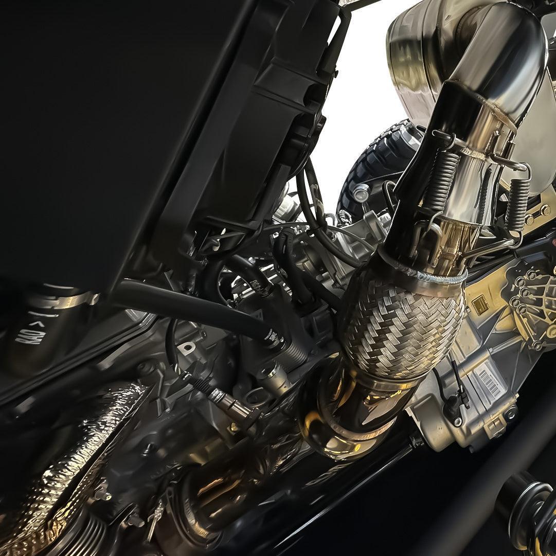 The Maverick R 3" Mid Pipe with resonator from RPM, is a beautifully polished, 304 stainless steel, & fully tig welded piece of art that frees up the maximum amount of power from your turbo Maverick R while adding a little bit of quiet. This 3" Mid Pipe performs as well as it looks! With the factory turbo being a 3" flange, and the factory mid pipe reducing to 2.5" and the exhaust flow later reducing to 2" in the muffler, RPM let the Maverick R breathe freely by creating this full 3" mid pipe that doesn't only bolt to the stock muffler, but EVERY muffler that RPM offers as well. Removing this bottle neck at the turbo frees up back pressure from the turbines exhaust wheel reducing unneeded back pressure and reduces heat build up. This allows for future upgrades to be painless & NO extra components later needed. This full 3", free flowing design is achieved by utilizing a proprietary 3" I.D. graphite ball end gasket that uses the OEM curvature and sealant allowing it to directly replace the factory 2.5" mid pipe and mount to the factory muffler, any muffler that uses the same factory locations, or any RPM SxS Maverick R Mufflers. This means if you have any muffler that uses the factory mid pipe, the RPM 3" mid pipe will work with it as well. Stock heat shields cannot be retained but RPM offers a Maverick R Heat Blanket specific to the Maverick R Mid Pipes.
