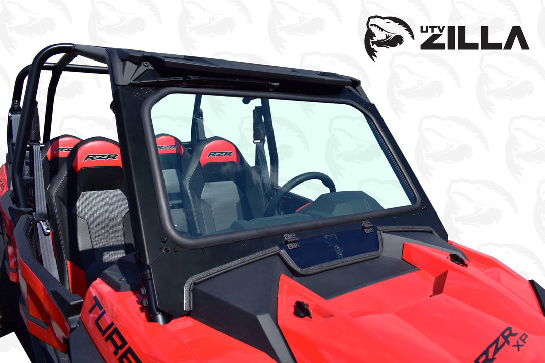 RED Vented Glass Windshield for 2019-2021 Polaris RZR UTVZILLA Glass Windshields offer incredible value for the money! UTVZILLA uses DOT certified, stamped glass with black stainless bolts standard on every glass windshield made. Adjustable flap style vents direct air into the cab to help keep you cool when open, and allows for better visibility when closed. With frames made from tough, powder-coated aluminum, you will have a top-quality windshield that will hold up to the elements. Features: Automotive Laminated Safety Glass with DOT Stamp Frame is made out of .125" Aluminum Black Powder-coat finish 3D CAD Designed and CNC Cut and formed Tinted Polycarbonate Vents that you can see through when closed Billet Aluminum Mounting Clamps Black Stainless Steel Bolts and Washers Designed & Made in the USA Wiper Included only fits with stock plastic visor* Fitment: 2019-2023 RZR XP 10002019-2021 RZR XP TURBO Glass Windshields: Glass is very scratch resistant but not scratch proof! While very hard and durable, glass can still be scratched if contaminants such as sand, small rocks, dirt etc. being rubbed on glass. Towels, windshield wipers, and squeegees can scratch glass if there are contaminants on the windshield. Any damage that is caused by interference from other aftermarket products will not be subject to any warranty claim. At time of purchase, buyer agrees to all policies, procedures, and returns processes. Windshields may not fit with aftermarket products such as: Roofs Stereos Mirrors with thick clamps Cab enclosures Must Read!!Shipping times: Most orders ship within 1-5 business days and take 2-5 business days after for delivery on average. Some orders may take longer. We do not guarantee shipping times and cannot control shipping carriers.Returns: Returns are subject to Restocking Fee and Return shipping costs. Items that have been installed or had protective film removed cannot be returned.Warranty: Any warranty claims will require pictures emailed within 5 business days of receiving order. WARNING: Cancer and Reproductive Harm - www.P65Warnings.ca.gov